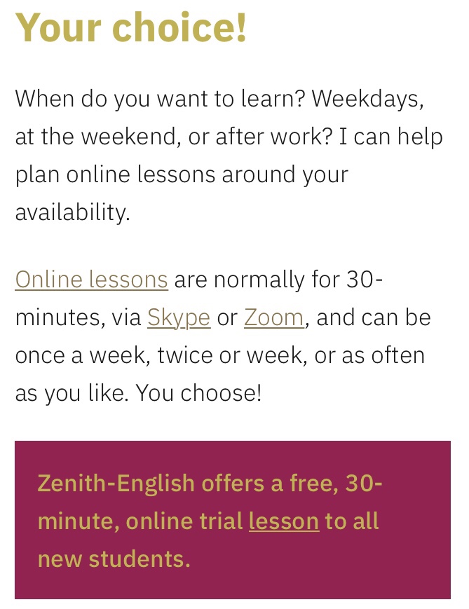 Online Lessons Posted byKelvin Clarke08/11/201908/11/2019Posted inSite Updates Details of online lessons using Skype and Zoom added. Share this: Click to share on X (Opens in new window) X Click to share on Facebook (Opens in new window) Facebook Like Loading... Published by Kelvin Clarke Founder and owner of Zenith-English: www.zenith-english.com Learn English as a foreign language. View more posts