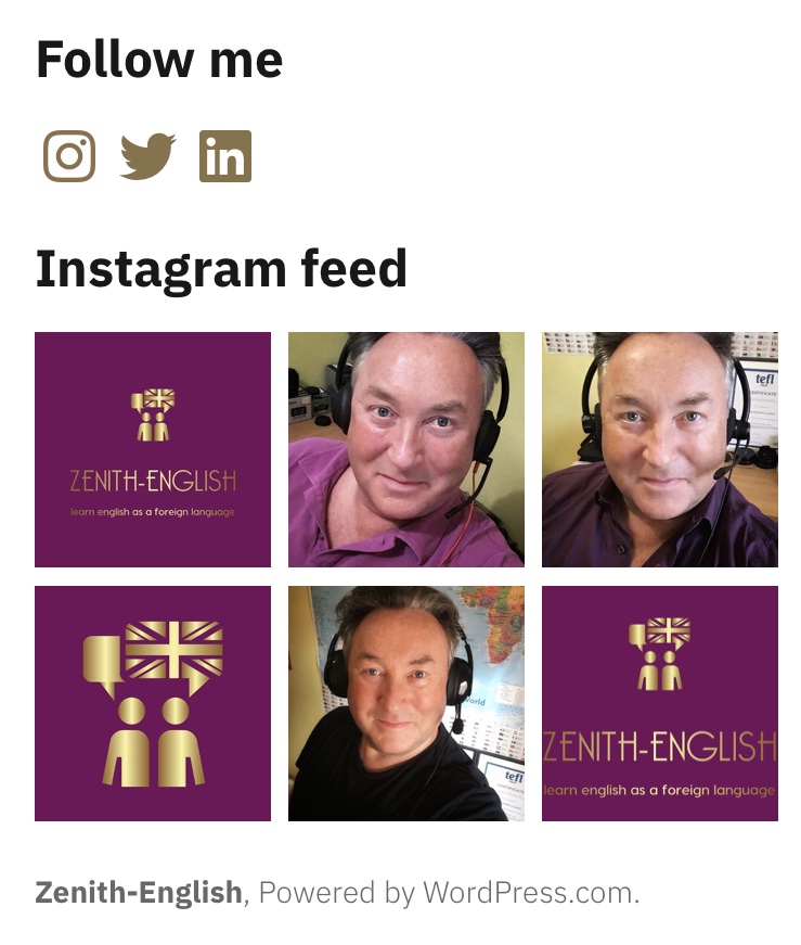 Instagram feed Posted byKelvin Clarke01/02/2020Posted inSite Updates I’ve added Zenith-English Instagram feed to the site. Share this: Share on X (Opens in new window) X Share on Facebook (Opens in new window) Facebook Like Loading... Published by Kelvin Clarke Founder and owner of Zenith-English: www.zenith-english.com Learn English as a foreign language. View more posts